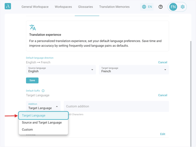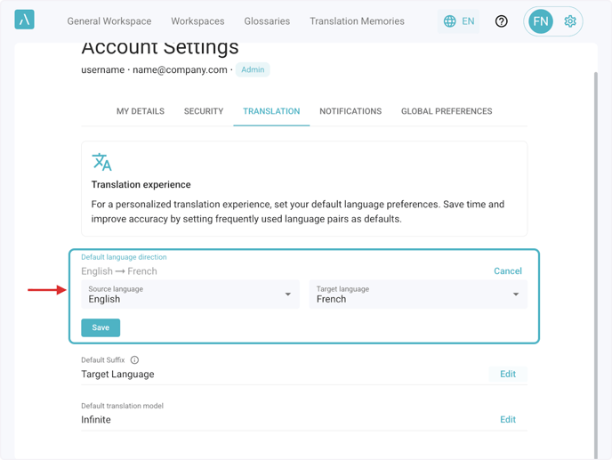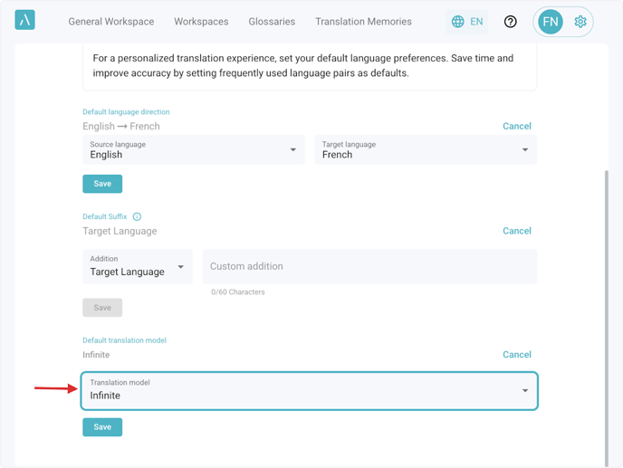 Under Default translation model, you can choose to use Infinite Translation or Neural Translation as the default model for all translation workflows across the platform.