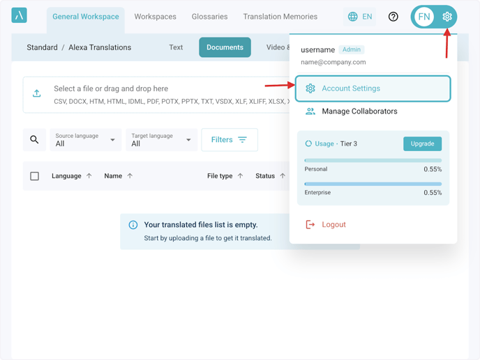 Configure translation preferences, such as default language direction, target file naming suffix, and the default translation model. Choose your preferred language for email notifications and manage how you receive system.