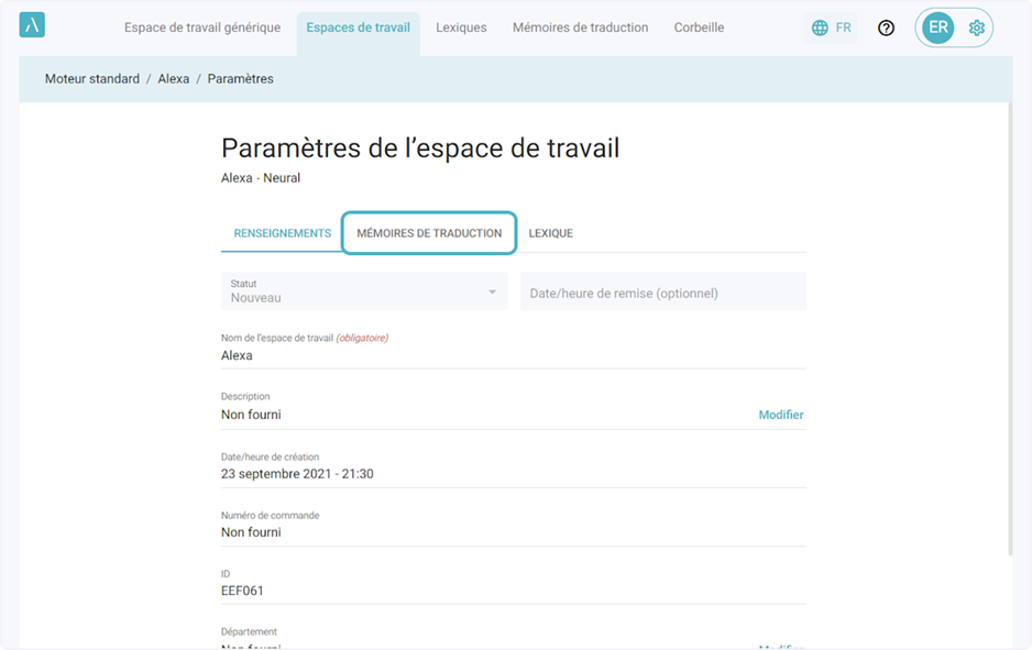 2. Cliquez sur l’onglet Mémoires de traduction.