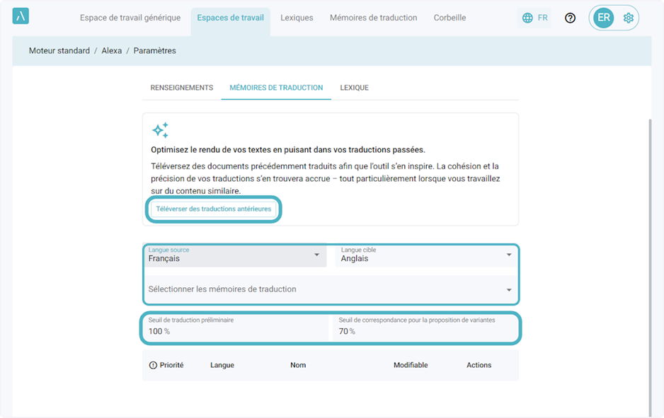 Vous y trouverez une section pour téléverser des traductions antérieures afin de créer automatiquement une mémoire de traduction, un espace pour choisir les langues source et cible et ajouter des MT existantes, et l’option de définir le seuil de traduction préliminaire et le seuil de correspondance pour la proposition d’options de traduction.