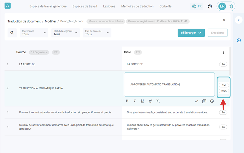 Pour vous assurer que votre mémoire de traduction est bien activée, traduisez un document contenant un segment qui se retrouve dans la mémoire dans l’espace de travail auquel celle-ci devrait avoir été intégrée. Une fois la traduction terminée, ouvrez l’éditeur de documents et consultez un segment qui correspond à un segment de la mémoire. Le type de source devrait être désigné « MT » (ou TM pour Translation Memory). Le pourcentage de correspondance indiqué sous le type de source indique le degré de similitude entre le segment de votre fichier et celui dans la mémoire de traduction.
