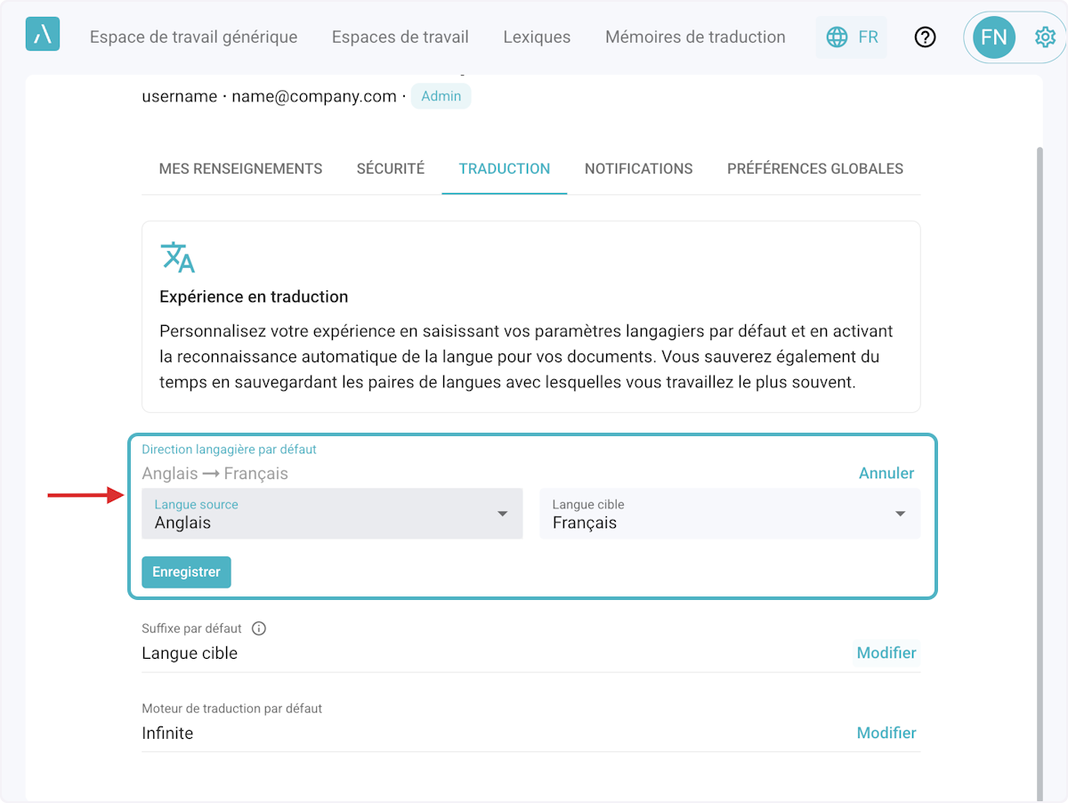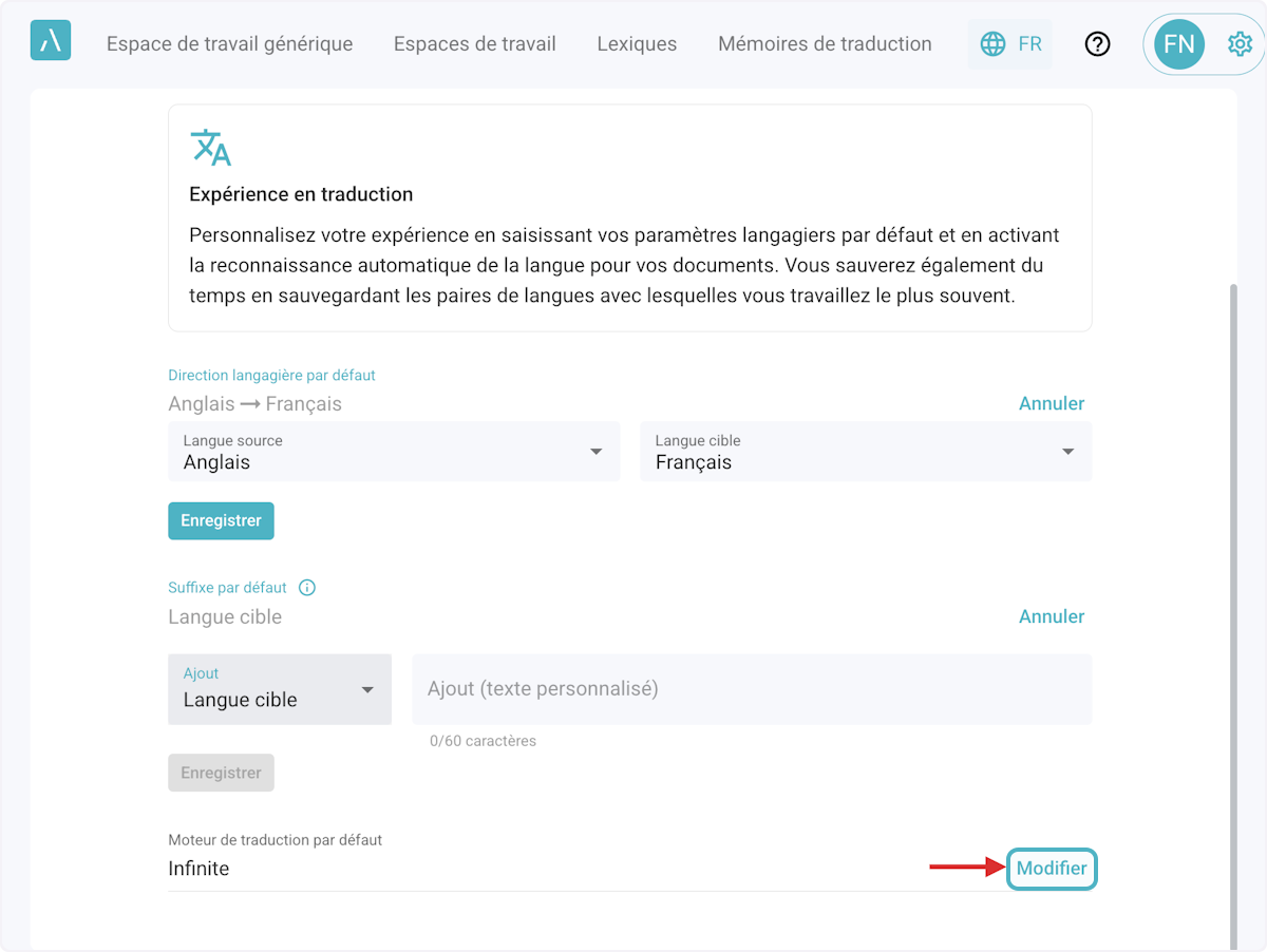 Configurez les préférences en matière de traduction, comme la direction langagière, le suffixe apposé au nom du fichier cible et le moteur de traduction par défaut.