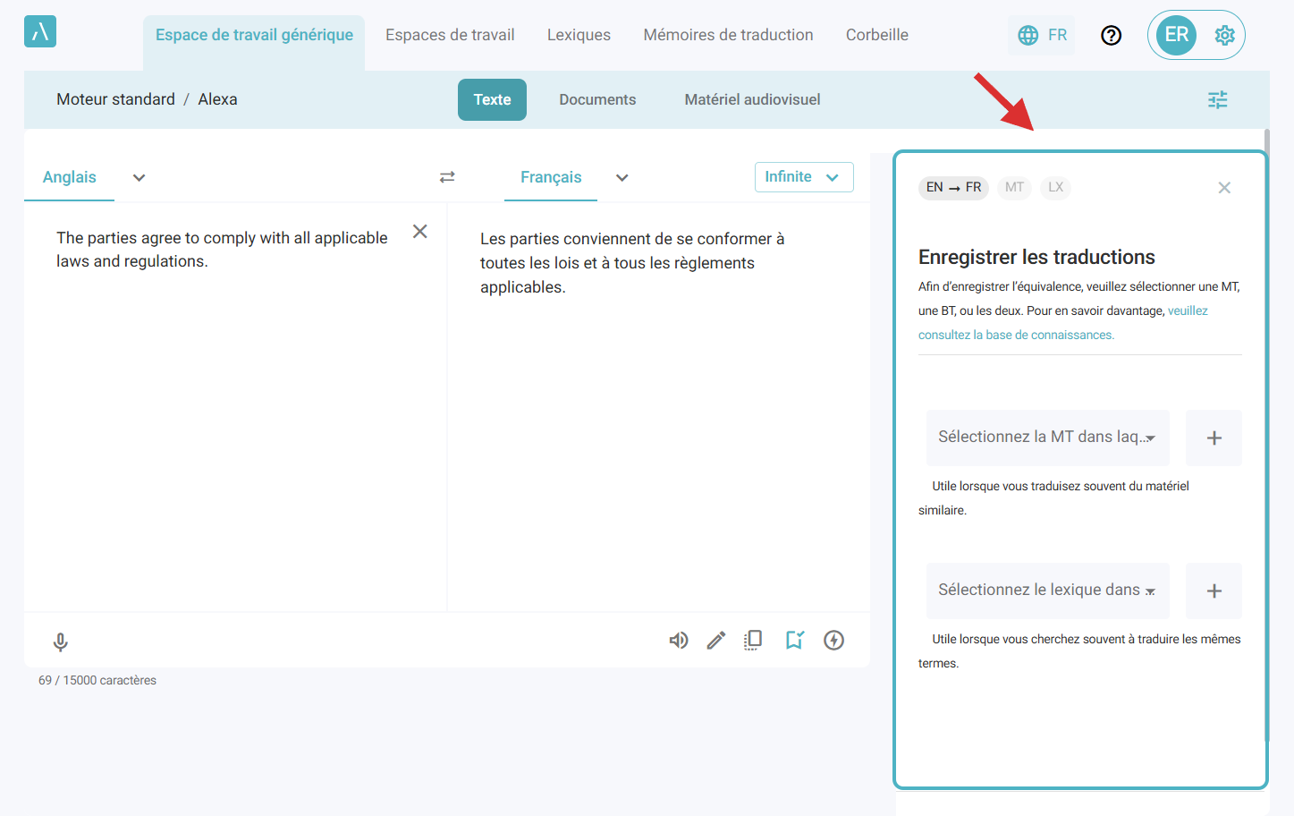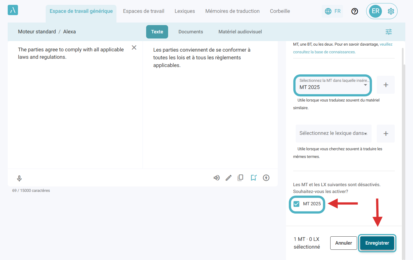 Vous pouvez sélectionner une mémoire de traduction ou un lexique à partir du menu déroulant pertinent.
