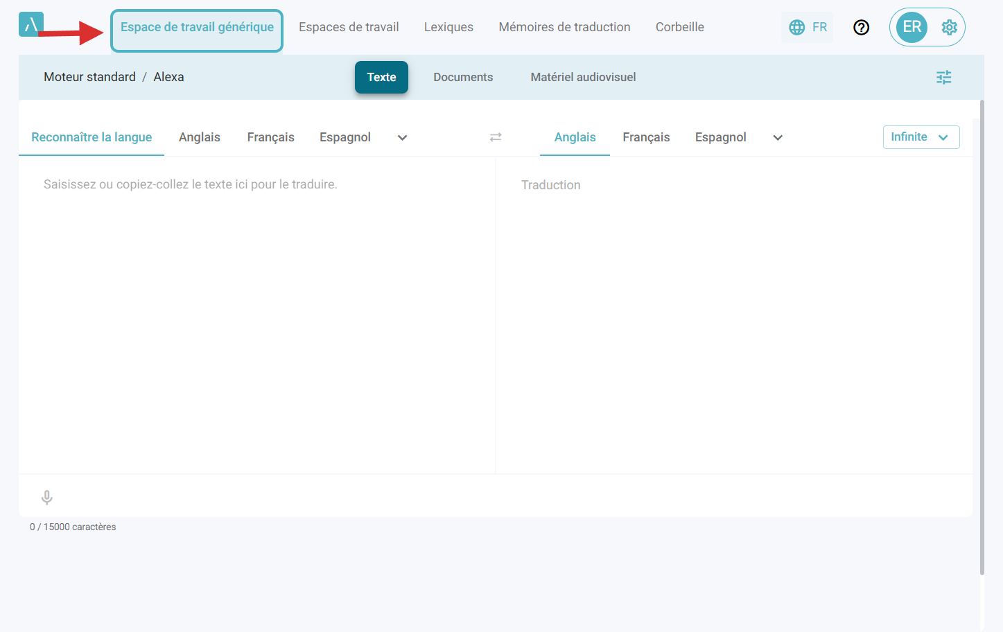 1. Cliquez sur l’onglet Espace de travail générique dans la barre de navigation. Cliquez ensuite sur l’onglet Texte.