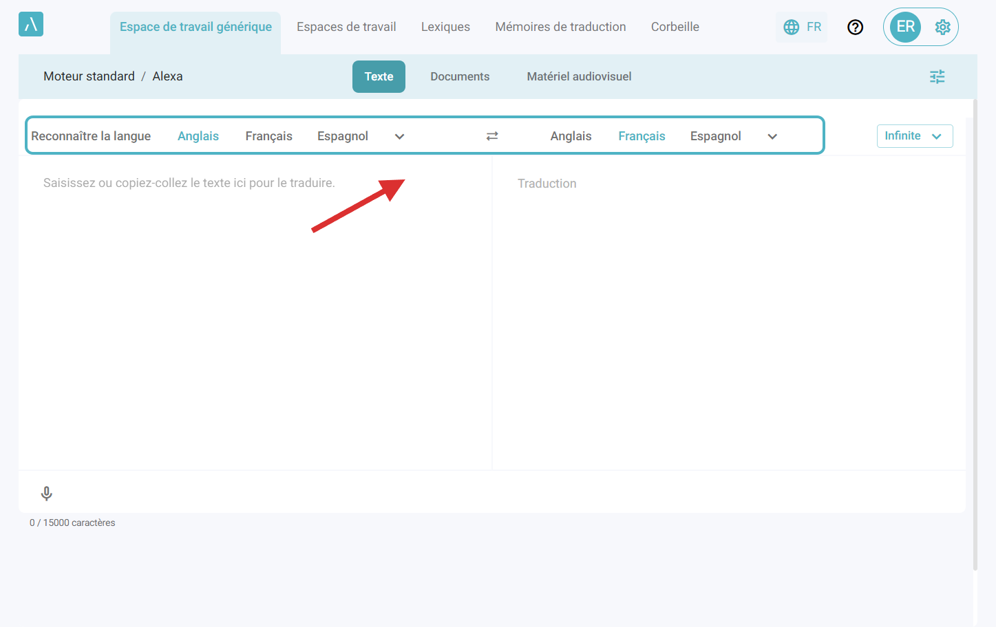 Pour votre commodité, vous pouvez également inverser les langues source et cible en cliquant sur l’icône des deux flèches au centre de la barre.
