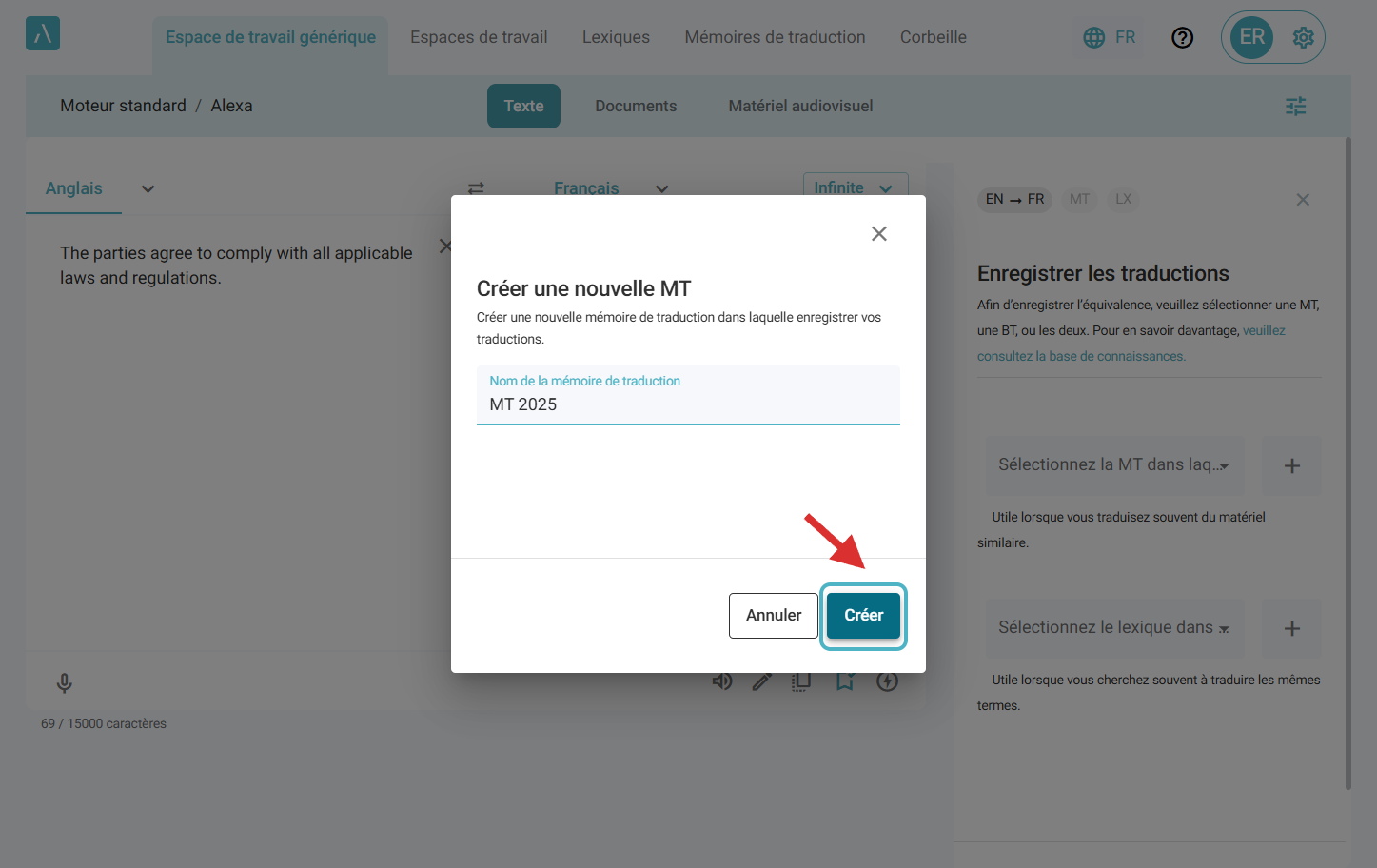 Une fois que vous cliquez sur Créer, la nouvelle mémoire de traduction ou le nouveau lexique sera automatiquement sélectionné dans la liste déroulante correspondante. Le processus de création de MT et de lexique dans cette section est identique.