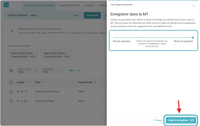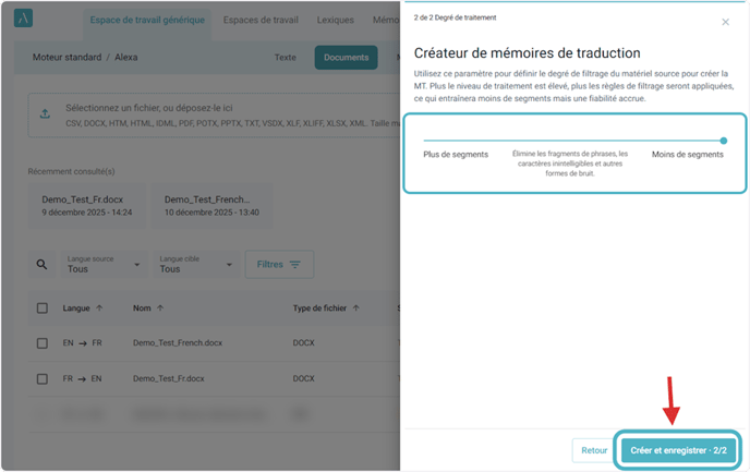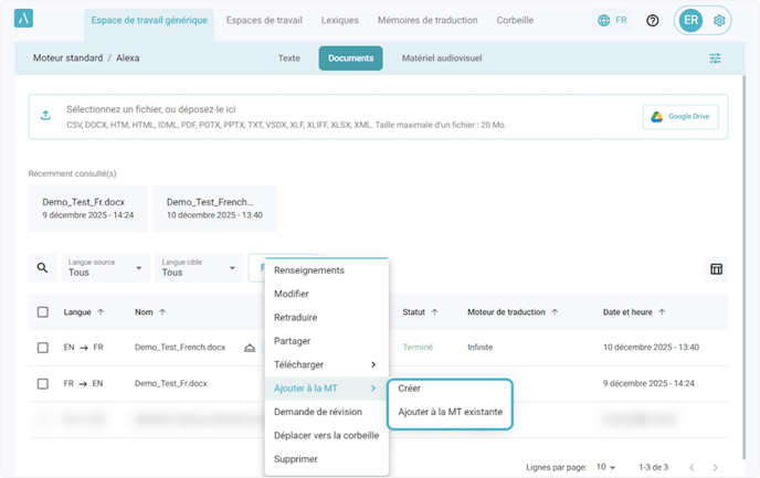 2. Après avoir traduit et révisé votre document, cliquez sur l’icône des trois points et cliquez sur l’option Ajouter à la MT dans le menu qui s’affiche. Vous verrez deux options s’afficher : Créer et Ajouter à la MT existante.