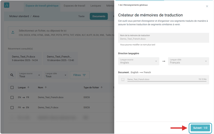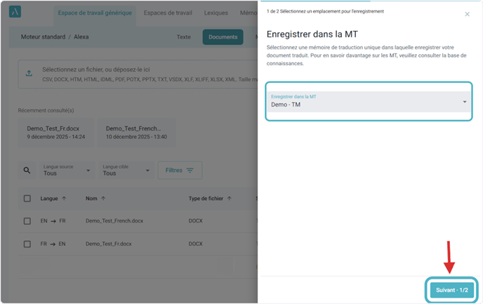 Cliquez sur le bouton Ajouter à la MT existante. En premier lieu, sélectionnez la MT existante à laquelle vous souhaitez ajouter le contenu du document, puis cliquez sur le bouton Suivant pour continuer.