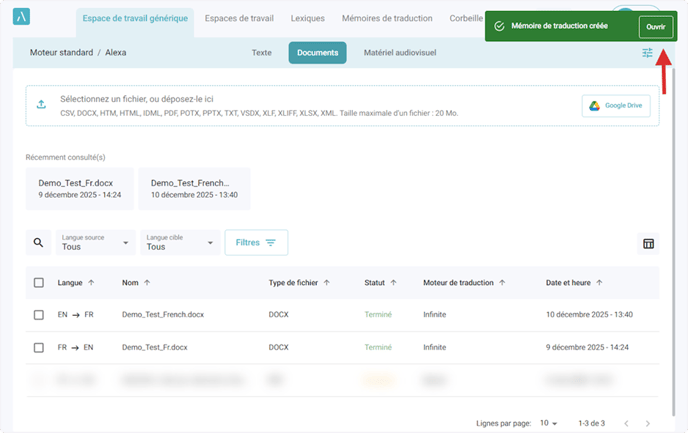 5. Cliquez sur Ouvrir dans le message qui s’affiche une fois que la mémoire de traduction est créée avec succès pour consulter son contenu.
