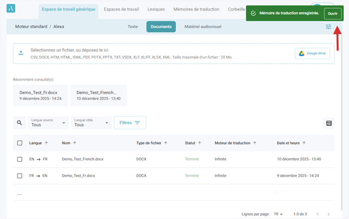 8. Cliquez sur Ouvrir dans le message qui s’affiche une fois que le contenu est ajouté avec succès à la mémoire de traduction pour le consulter.