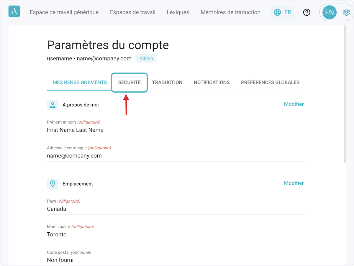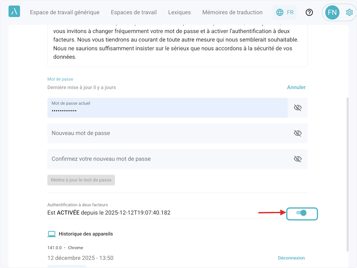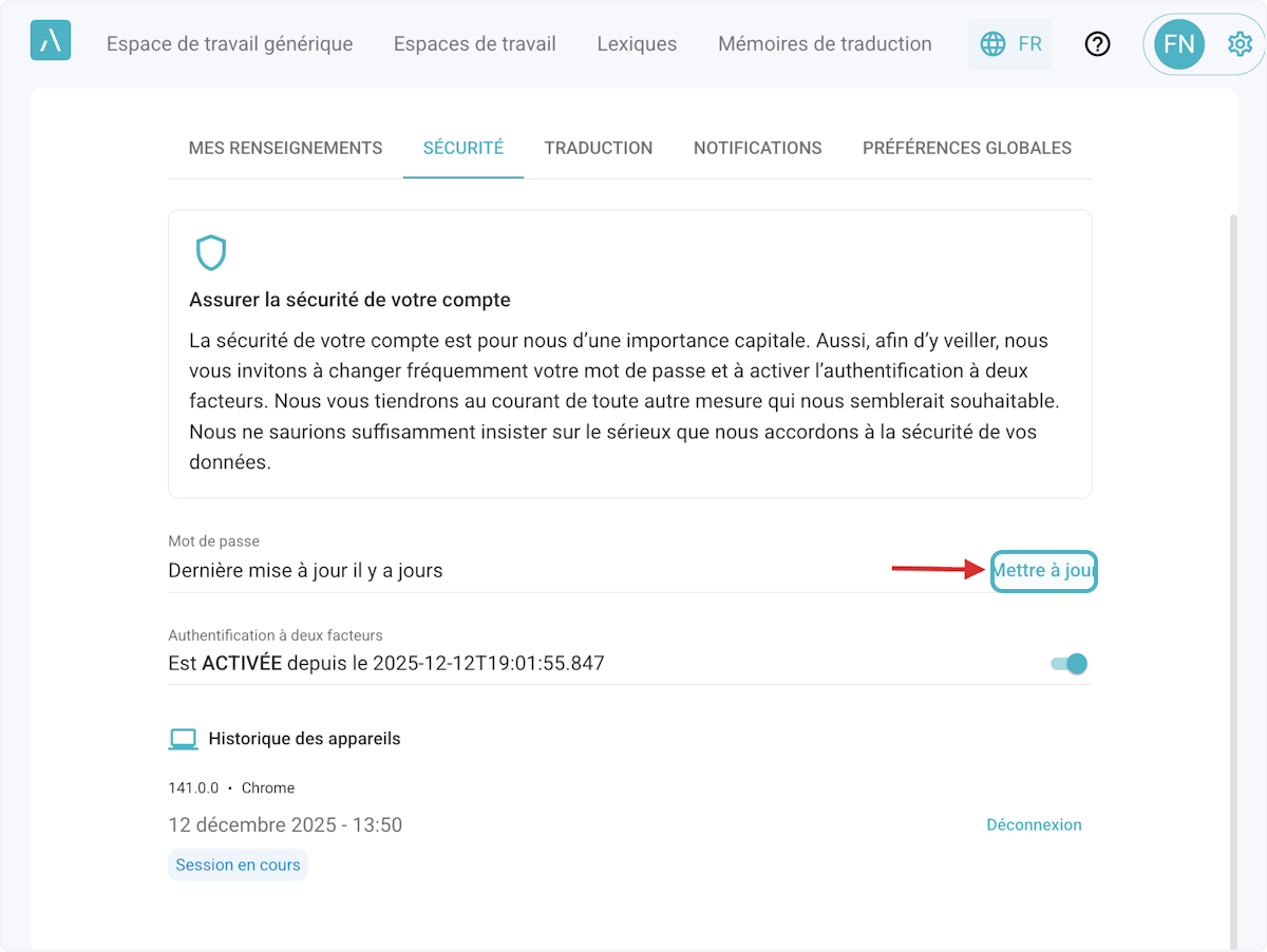 Dans cette section, vous pouvez gérer vos paramètres de sécurité, notamment modifier votre mot de passe, activer l’authentification à deux facteurs et consulter l’historique des appareils utilisés pour se connecter à ce compte.