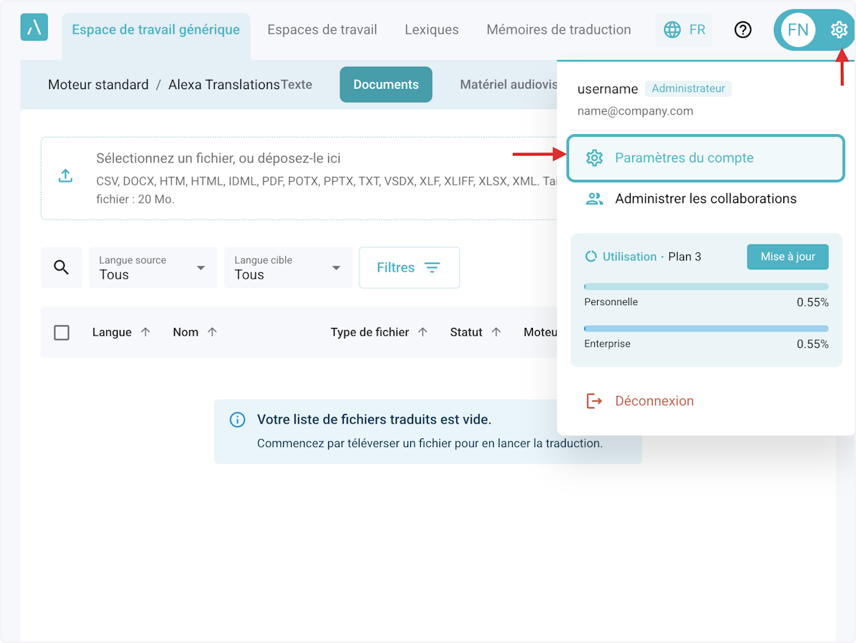 1. Cliquez sur le bouton des paramètres, puis sur Paramètres du compte.