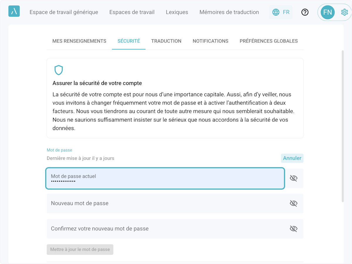 4. Saisissez le mot de passe actuel et le nouveau mot de passe, puis cliquez sur Mettre à jour le mot de passe pour enregistrer vos modifications.