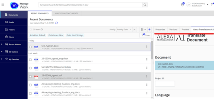 - Une fois que le complément Alexa Translations A.I. a été intégré avec succès à iManage, l’onglet Alexa Translations A.I. devrait être visible dans le menu de droite.