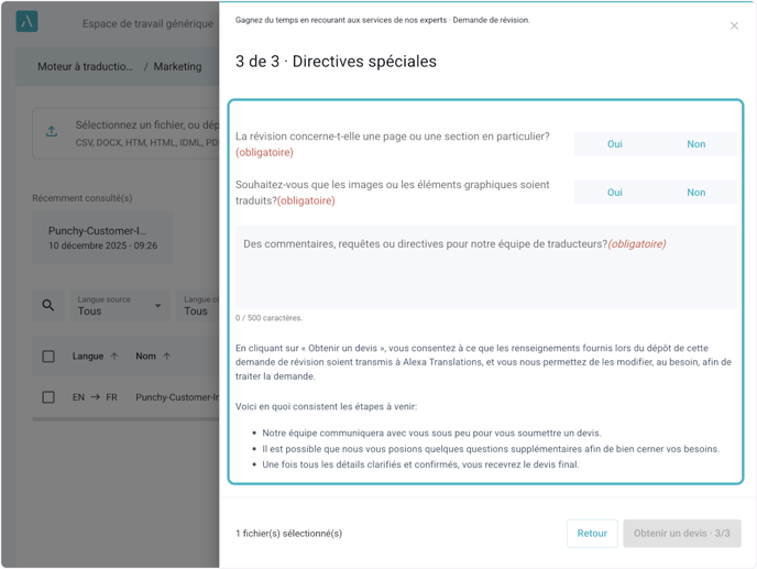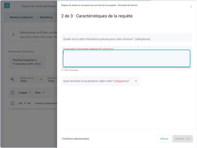 Saisissez la date d’échéance prévue pour la révision, le public auquel le document traduit s’adresse et le territoire cible.