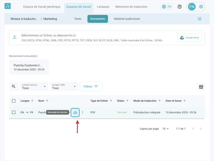 1. Cliquez sur l’icône Demande de révision à côté du nom du document traduit.