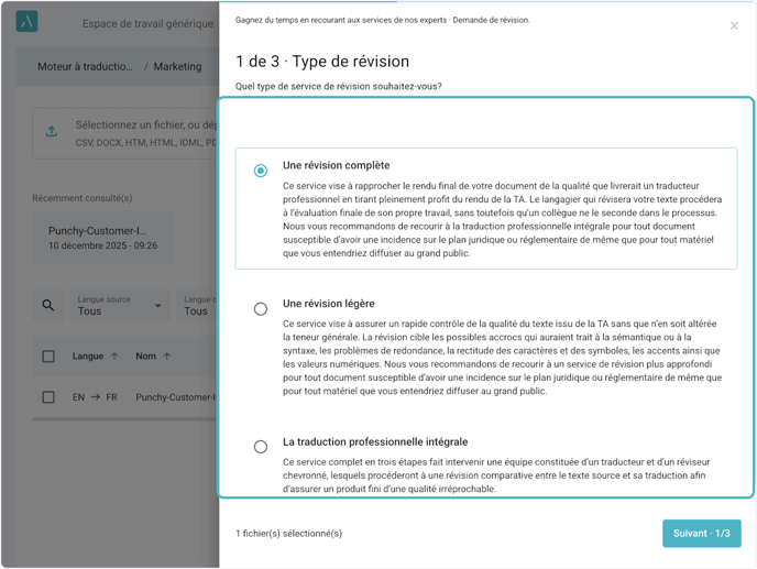Les options sont la révision complète, la révision légère et la traduction professionnelle intégrale.