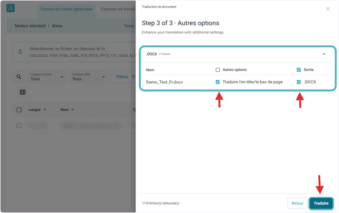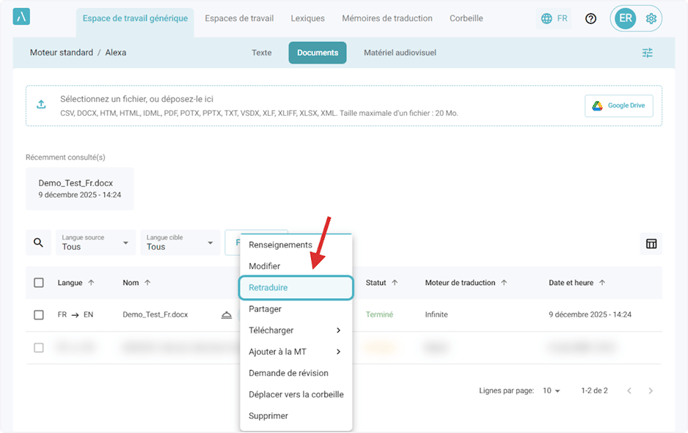 8. La fonctionnalité Retraduire vous permet de traduire à nouveau le même document source en utilisant des paramètres différents, comme une nouvelle langue cible ou des options supplémentaires.