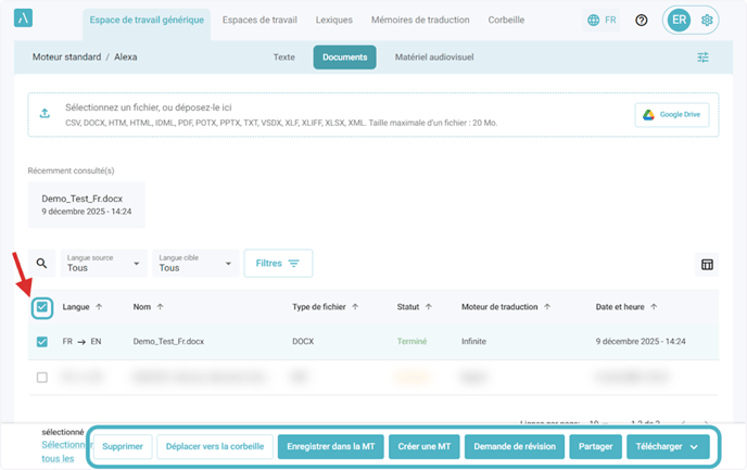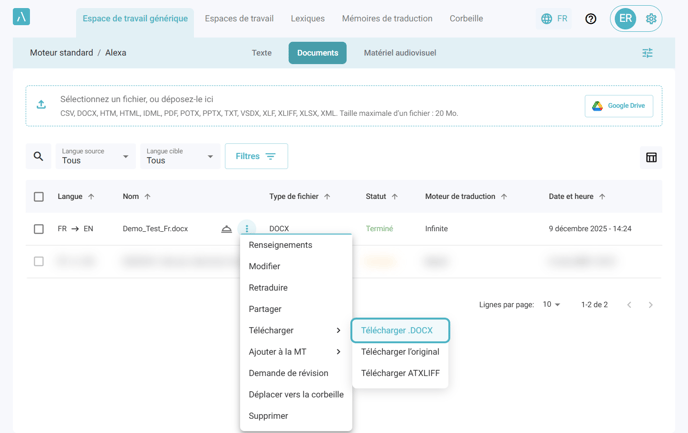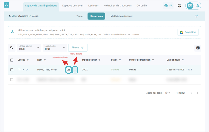 6. Une fois la traduction terminée, positionnez le curseur sur la rangée correspondant au document pour afficher le menu d’actions (trois points) et l’option de demande de révision.
