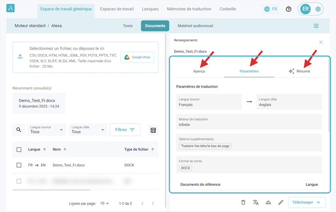9. Dans la section Renseignements, vous pouvez consulter les paramètres de traduction appliqués au document, un aperçu du document traduit (pour certains types de fichiers) et un résumé du contenu du document généré par l’IA.