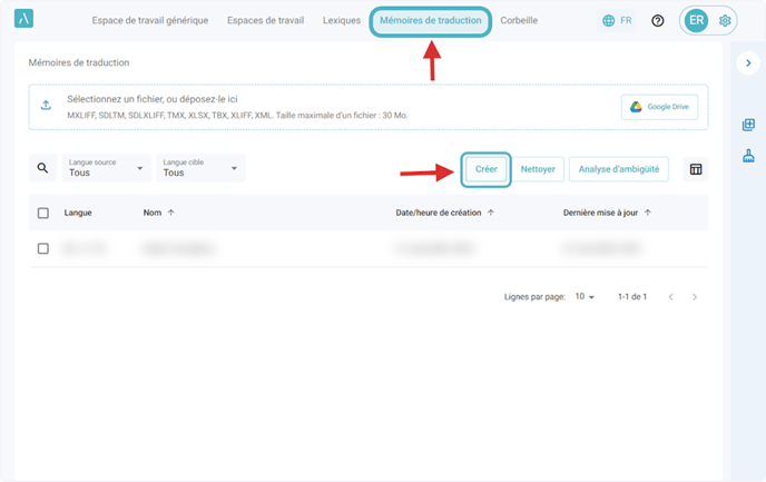 1. Cliquez sur Mémoires de traduction dans la barre de navigation. Cliquez sur le bouton Créer.