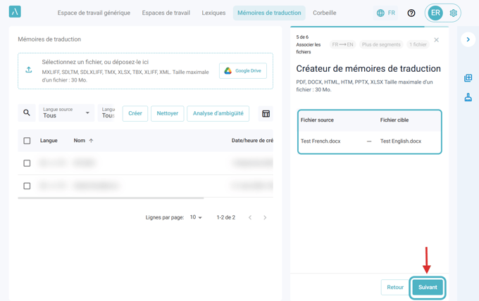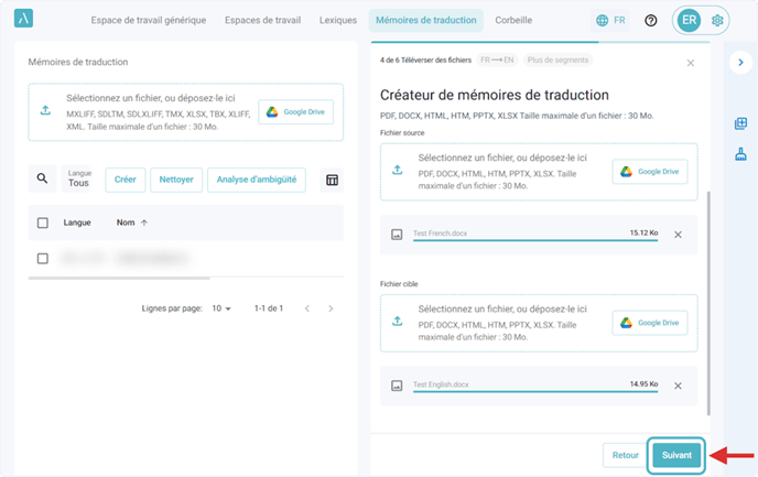 5. Glissez-déposez vos documents source et cible dans les zones prévues à cet effet. Vous pouvez également cliquer sur ces zones pour sélectionner des fichiers de votre ordinateur ou cliquer sur le bouton Google Drive pour choisir des fichiers de cet emplacement. Cliquez ensuite sur le bouton Suivant pour continuer.