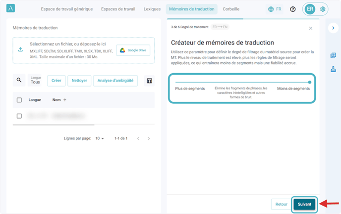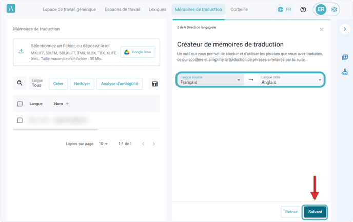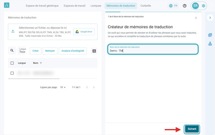 2. Saisissez le nom de la mémoire de traduction, puis cliquez sur le bouton Suivant pour continuer.