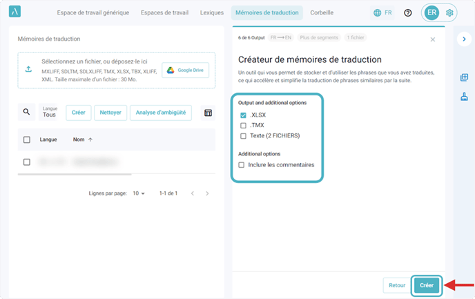 7. Dans cette dernière étape, choisissez le type de fichier de sortie et cochez au besoin l’option Inclure les commentaires si vous souhaitez que les commentaires contenus dans les fichiers soient également associés et inclus dans la mémoire de traduction. Cliquez ensuite sur Créer.