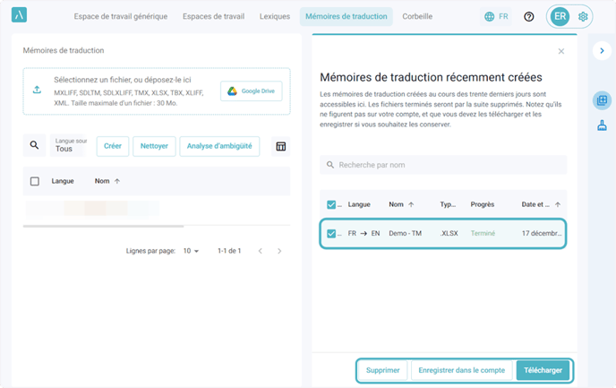 8. Une fois que la création de la mémoire de traduction est terminée, vous pouvez la sélectionner et prendre les actions nécessaires. Vous pouvez la télécharger, l’enregistrer dans votre compte afin qu’elle s’affiche dans le tableau des mémoires de traduction, ou la supprimer au besoin.