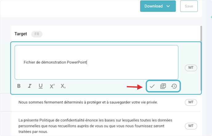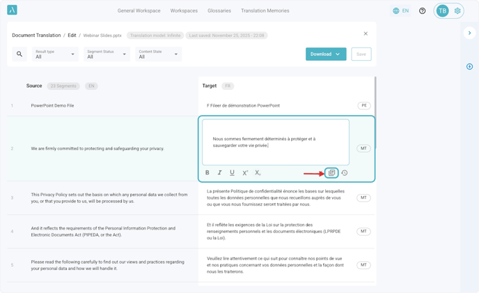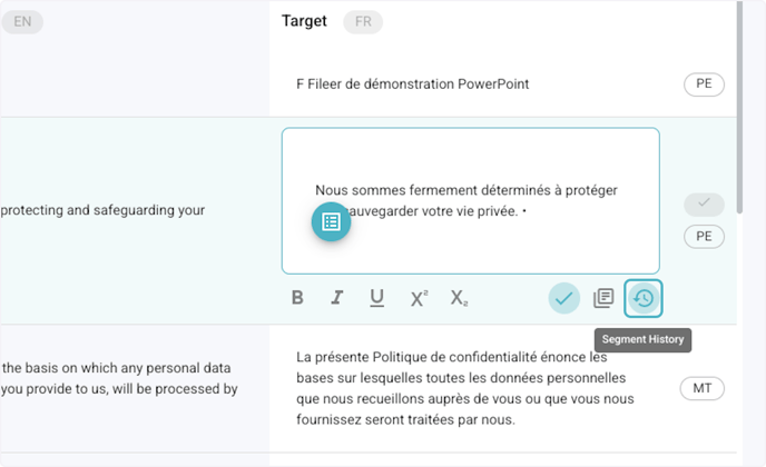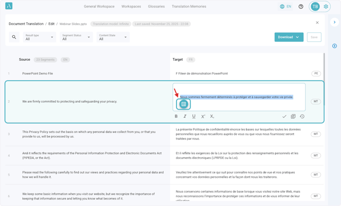 2. Click on the Target segment to edit the translated text.