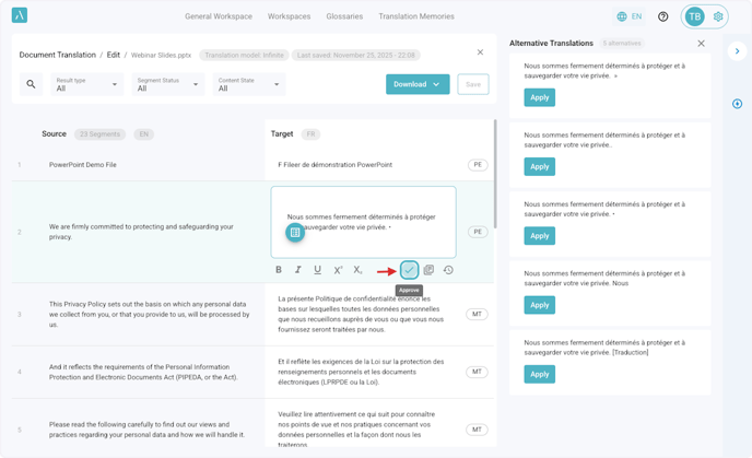 Select the text and click the Alternative Translations icon to see all the available alternative translations for the same text.