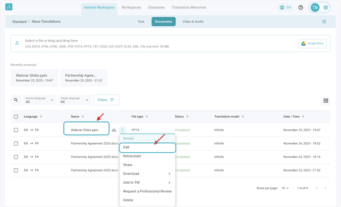 Alternatively, hover over the document to display the Action menu, then click Edit.