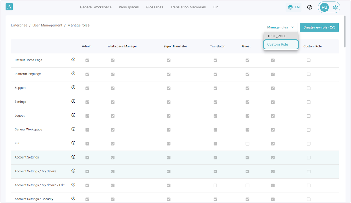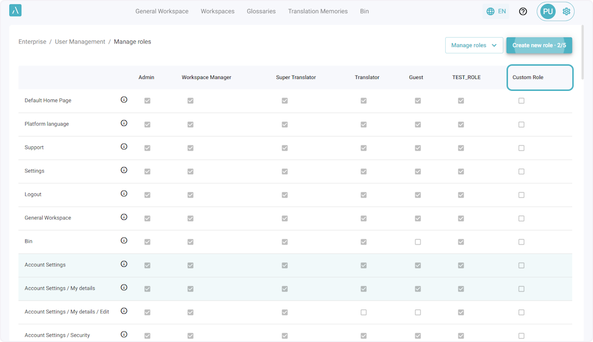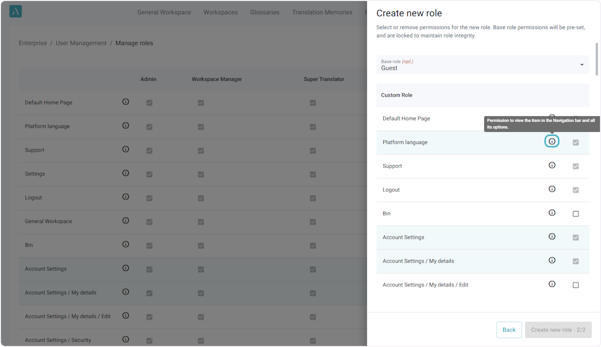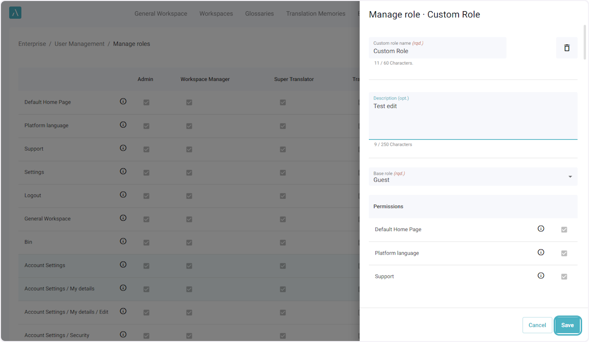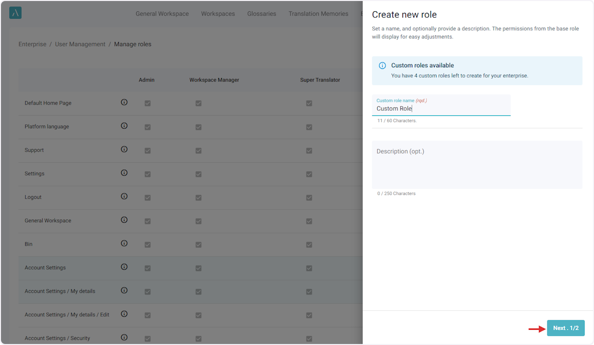 ℹ️ Le nombre maximal par défaut de rôles personnalisés pour une entreprise est de 5. Si vous avez besoin de rôles supplémentaires, veuillez envoyer un courriel à l’adresse ai_support@alexatranslations.com pour obtenir de l’aide.