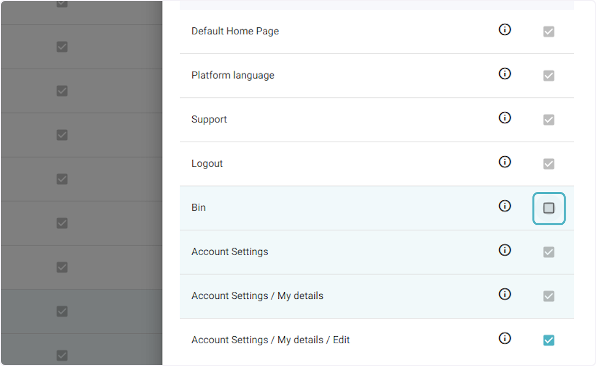 Les permissions sont regroupées selon la fonctionnalité concernée pour faciliter la sélection. Cliquez sur l’icône « i » à côté de chaque permission pour voir sa description dans une infobulle.
