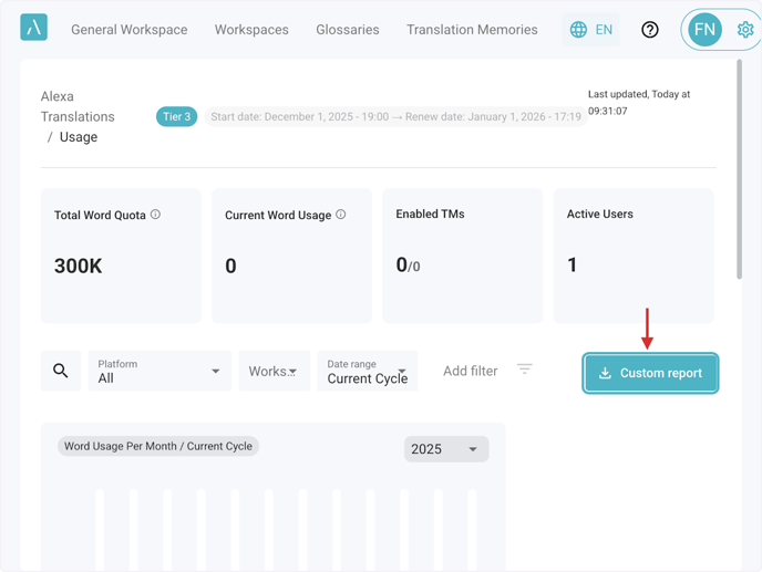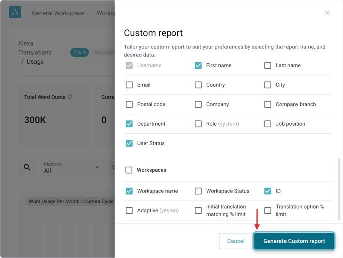 Select additional data dimensions as columns to include in your report and then click Generate Custom report. Mandatory columns are pre-selected and cannot be changed.