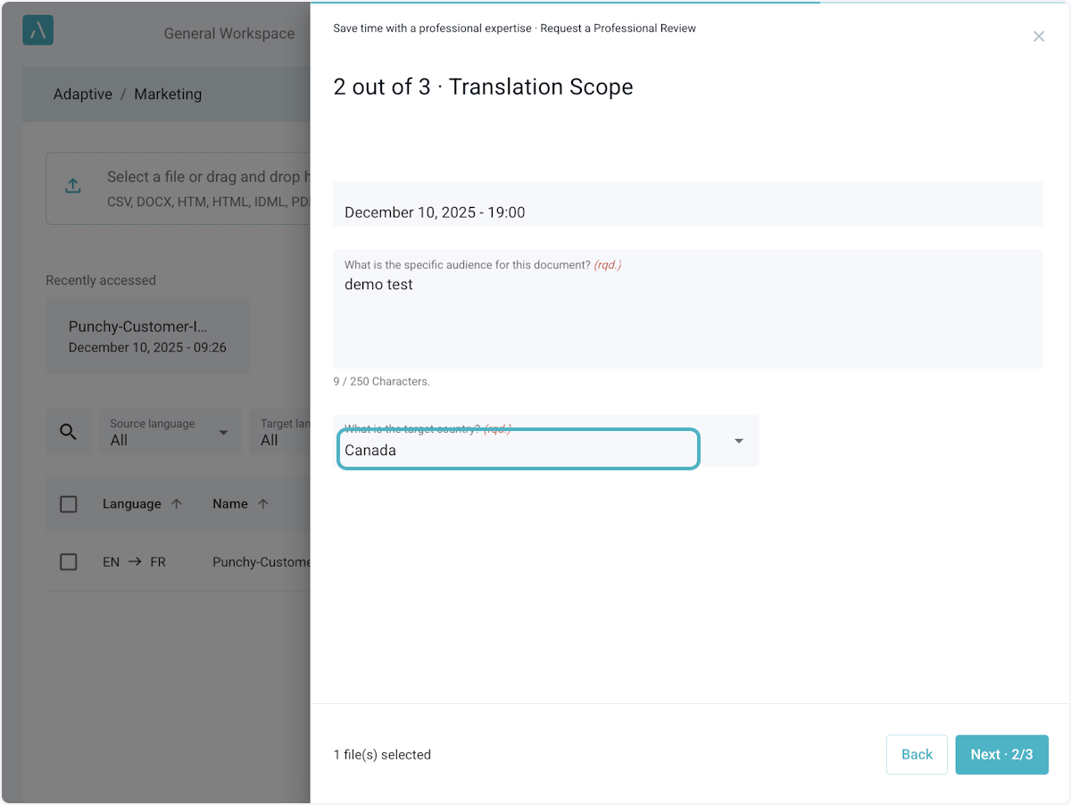 Enter the desired deadline for the review, the target audience, and region.