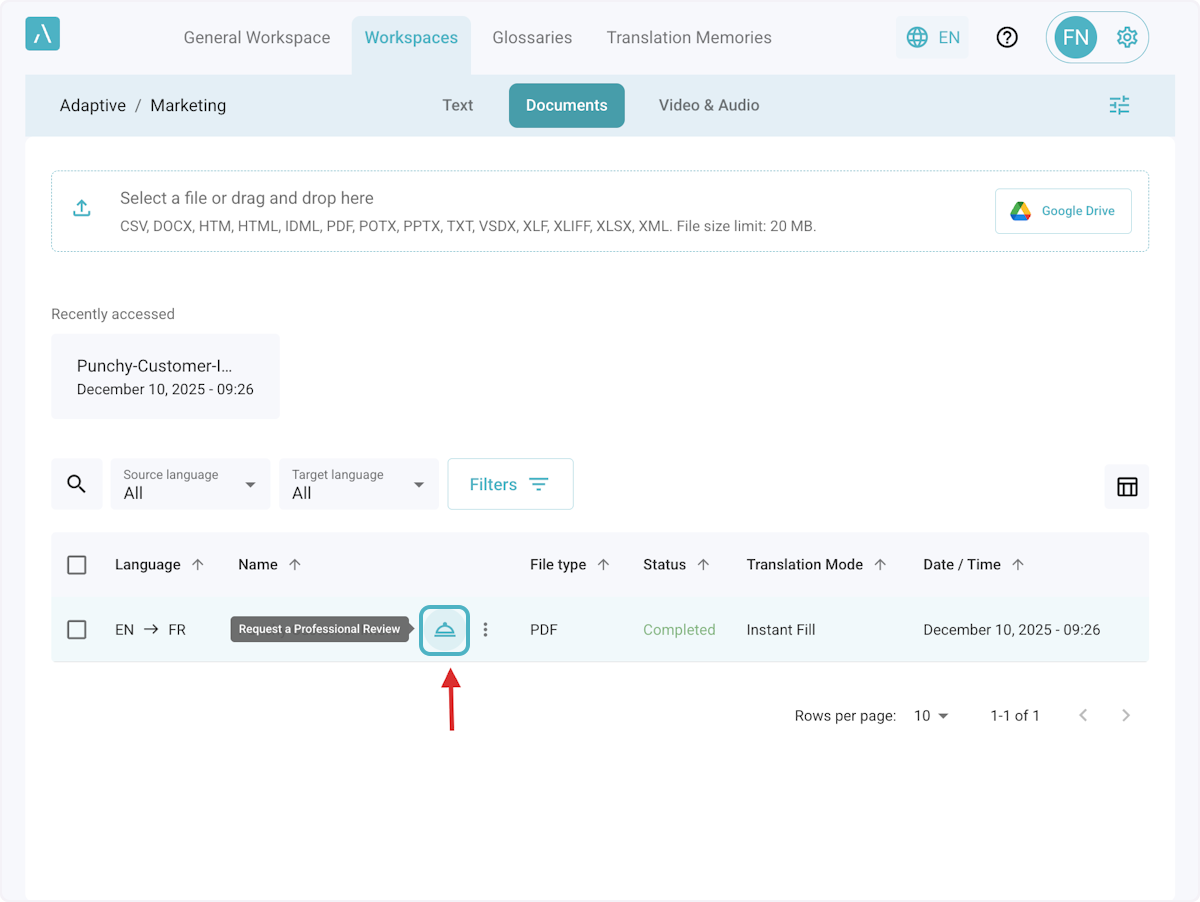 1. Click on the "Request a professional Review" icon on any completed document.