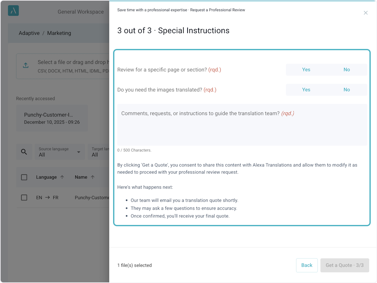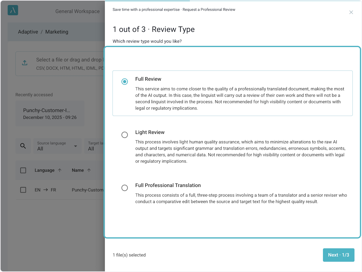 Options are Full Review, Light Review, and Full Professional Translation.