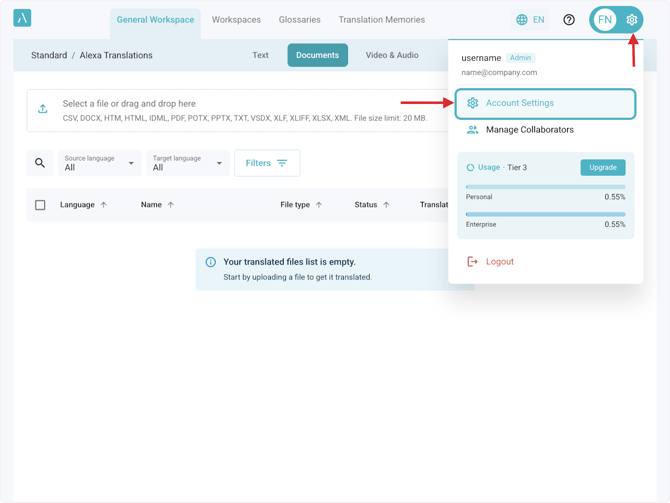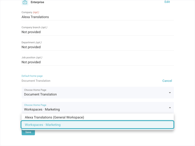 Field 2: If Document, Text, or Video/Audio Translation was selected, here you can select which workspace you want to view that in