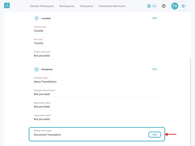 2. Scroll to the bottom of the My Details tab and click Edit at the Default Home Page field