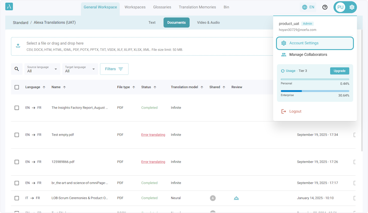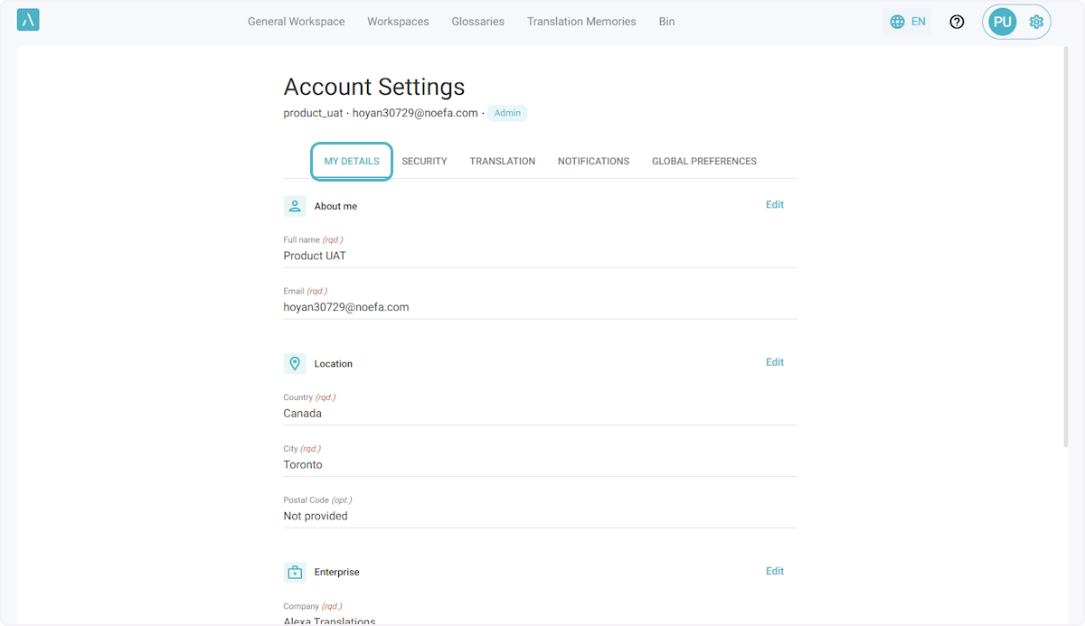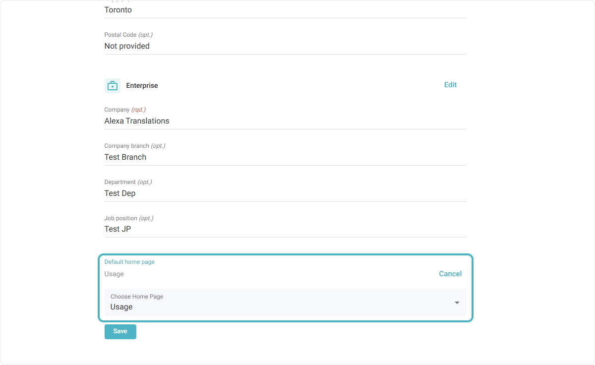 Learn how to update your personal and enterprise information, including your name, email, location details, company details, and your default homepage.