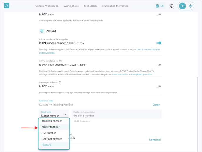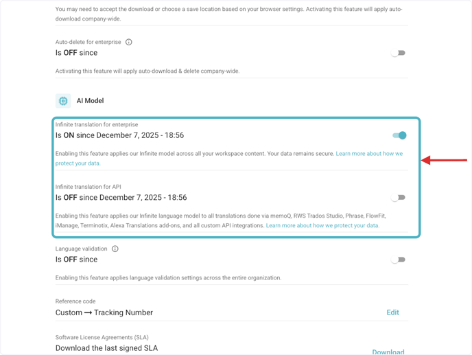 Enable or disable Infinite translation model for enterprise and Infinite translation for API, by switching the toggle next to each setting.