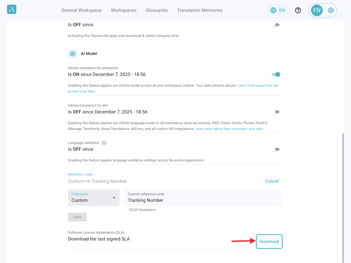 5. Click on Download to download the last signed Software License Agreements (SLA).